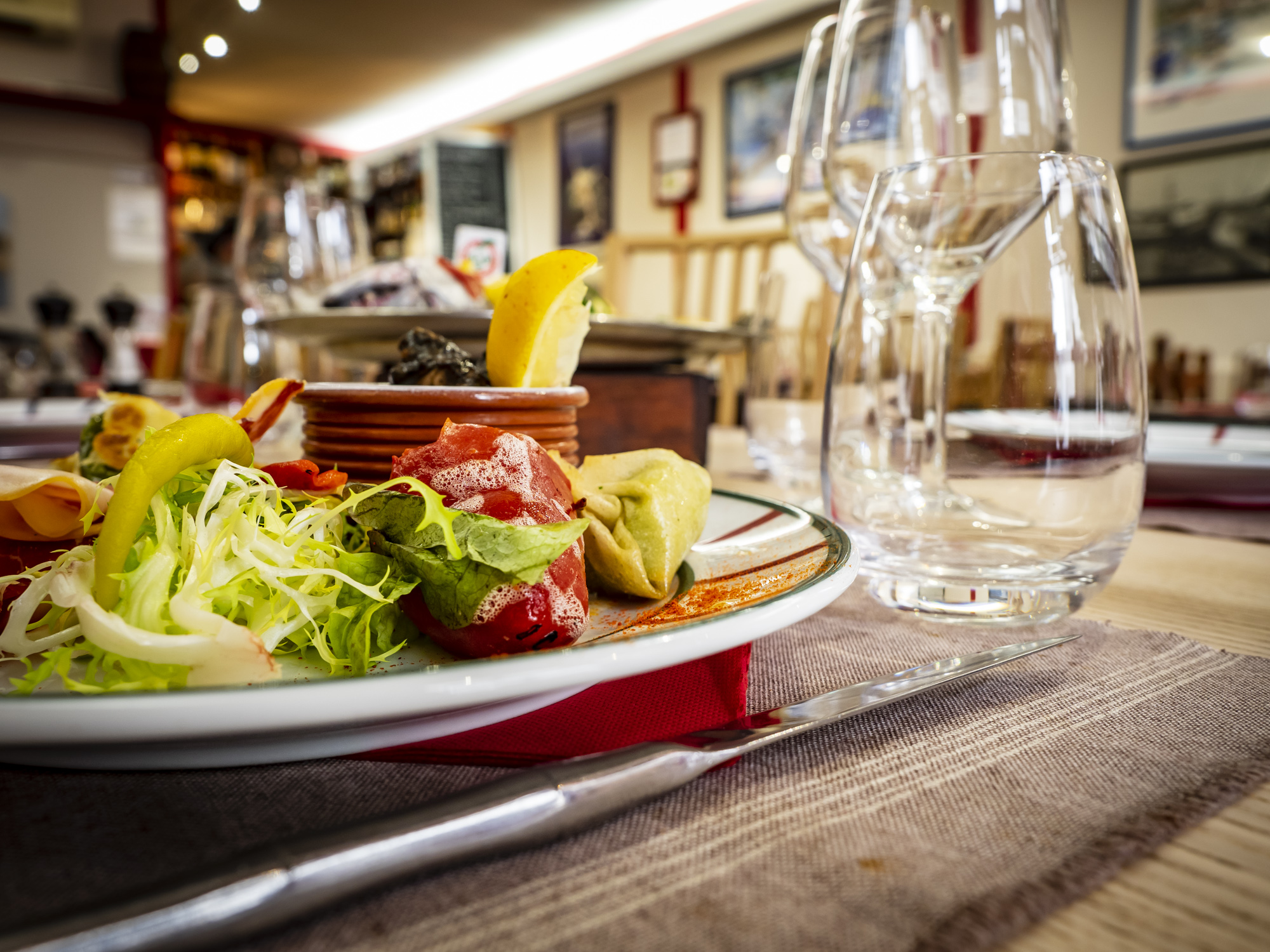 Une salle avec 26 places, décorée avec des filets de pêche, des bouteilles de vin et des photos de bateaux de pêcheurs. Il est préférable de réserver votre table, pour votre déjeuner ou votre dîner, au PiL PiL ENEA. Vous avez également la possibilité de privatiser le restaurant pour un anniversaire, une fête de famille ou une soirée entre amis.
