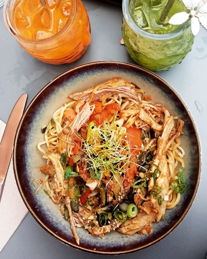 Cantina que ofrece cocina mundial con opciones vegetarianas y veganas. Se ofrecen jugos frescos y comida casera.