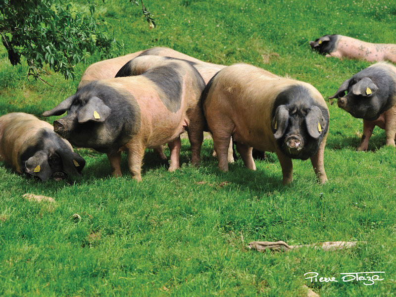 Situada en el valle de ALDUDES (BANKA, ALDUDE, UREPEL), a 40 km de PAMPLONA y a 65 km de BAYONA, la explotación familiar de PIERRE OTEIZA cría cerdos de raza vasca, negros y blancos de grandes orejas caídas, al aire libre en la montaña. especificaciones del AOP KINTOA.